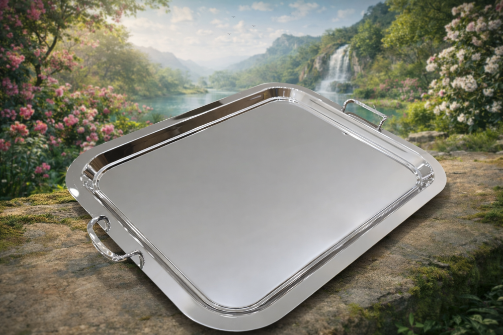 Large stainless steel tray. Length 63 cm, width 47 cm